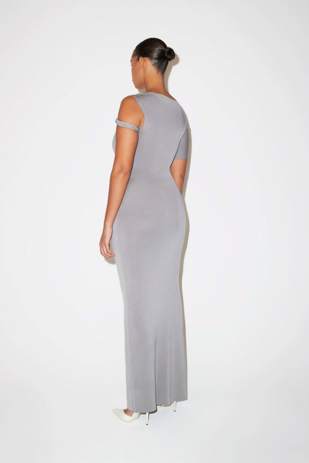 М’яка замшева тканина, еластичний крій, асиметричний дизайн із twist-деталлю, довжина максі.